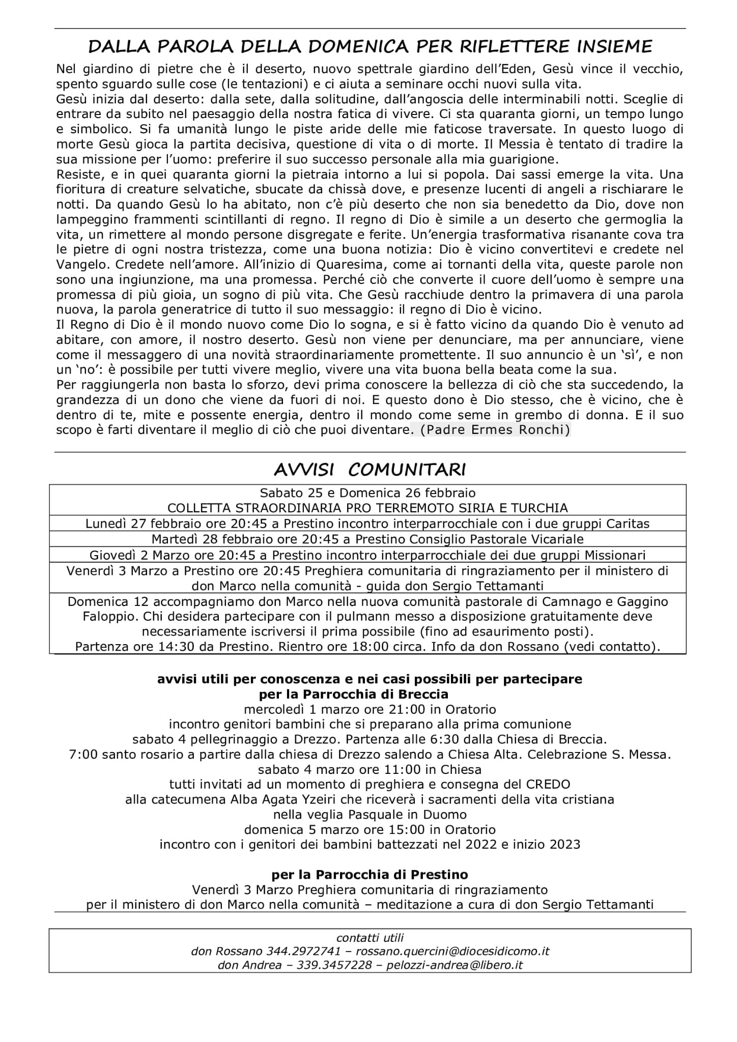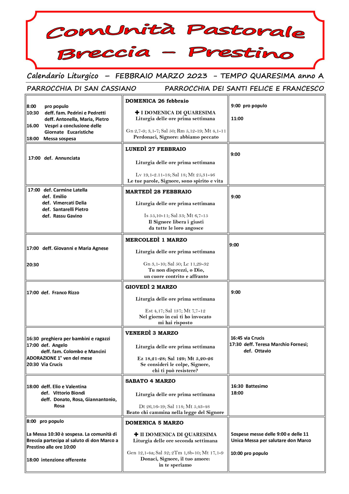 Avvisi dal 26 febbraio al 5 marzo Agenda parrocchiale/ Avvisi/ In home page/ Senza categoria 25 febbraio 2023, parrocchiadiprestino